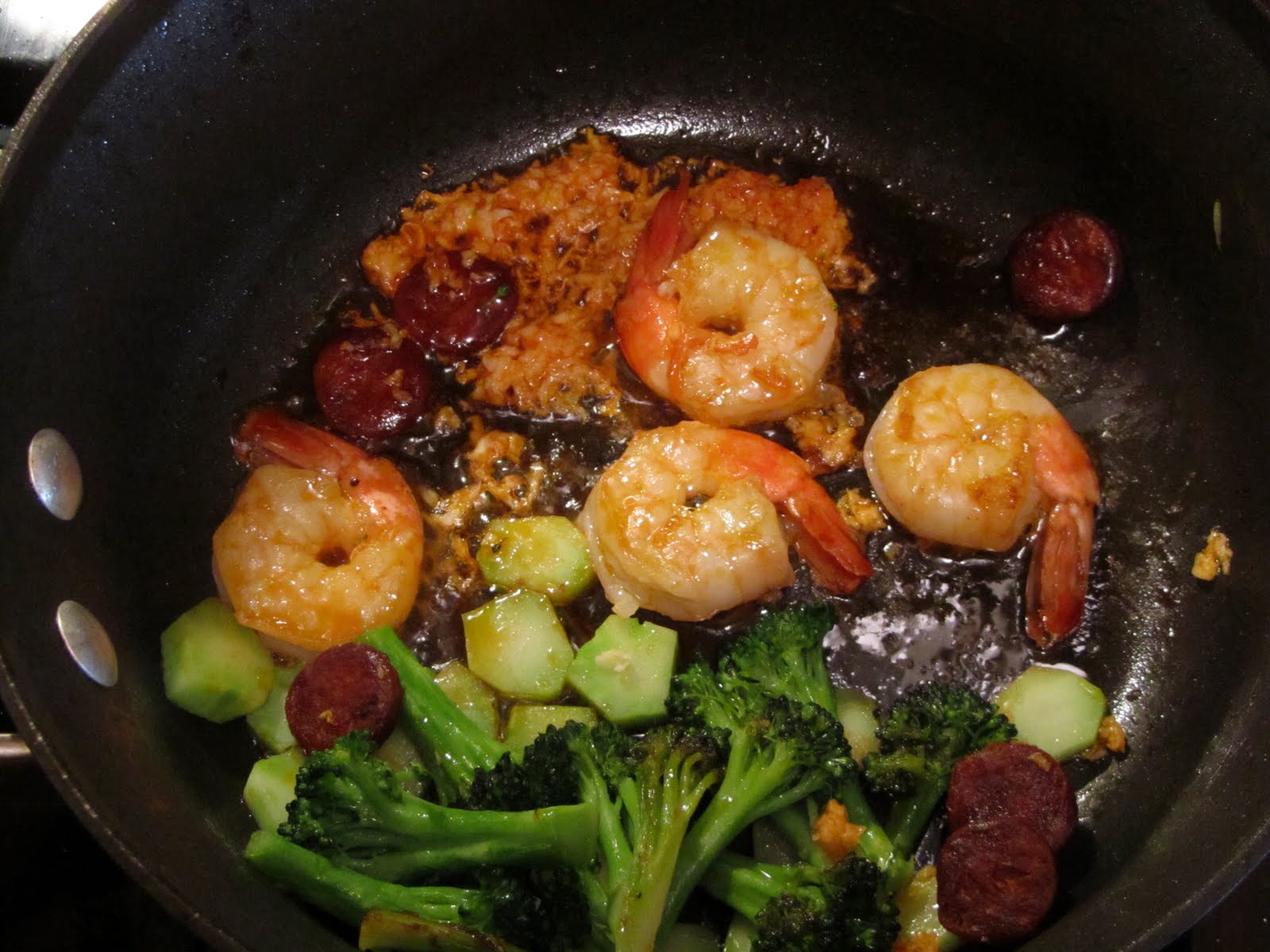 When it's time to flip the chorizo to the second side I add a few defrosted raw shrimp into the mix, and add another pinch of salt (largely on the shrimp). Cook the shrimp about 2-3 minutes per side until opaque and firm.
